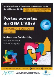 Dans le cadre de la semaine d'informations sur la santé mentale 2025, le GEM L'ALIZÉ organise ses portes ouvertes le Mercredi 8 octobre de 12h à 18h à la Maison des Solidarités , 2b rue burnouf, 50700 VALOGNES. En savoir plus